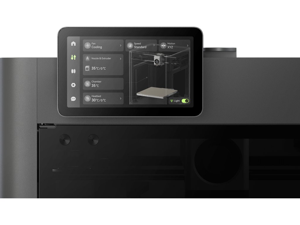 Výrazné inovace se najdou i v chlazení: adaptivní systém proudění vzduchu cíleně nasává chladný vzduch zvenčí a optimalizuje teplotu. Díky tomu lze bezpečně tisknout jak citlivé, tak technické materiály – od PLA po ABS. Speciální tepelná klapka udržuje teplo tam, kde je potřeba, zatímco aktivní uhlíkový filtr čistí vzduch uvnitř.
