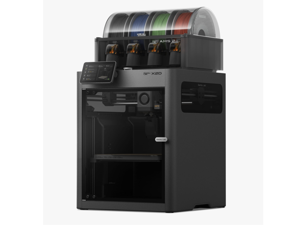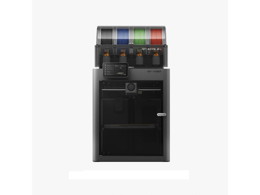 Bambu Lab X2D je druhá generace prémiové řady X a přináší duální tryskový (hotendový systém) pro externí podpory a vícebarevný tisk, aktivně vyhřívanou komoru 65 °C pro náročnější materiály a třístupňovou filtraci pro bezpečný provoz i doma. Vše v kompaktním těle s tiskovým objemem 256 × 256 × 256 mm a rychlostí až 1 000 mm/s. Combo balení obsahuje AMS 2 Pro pro automatické podávání až 4 materiálů nebo barev.