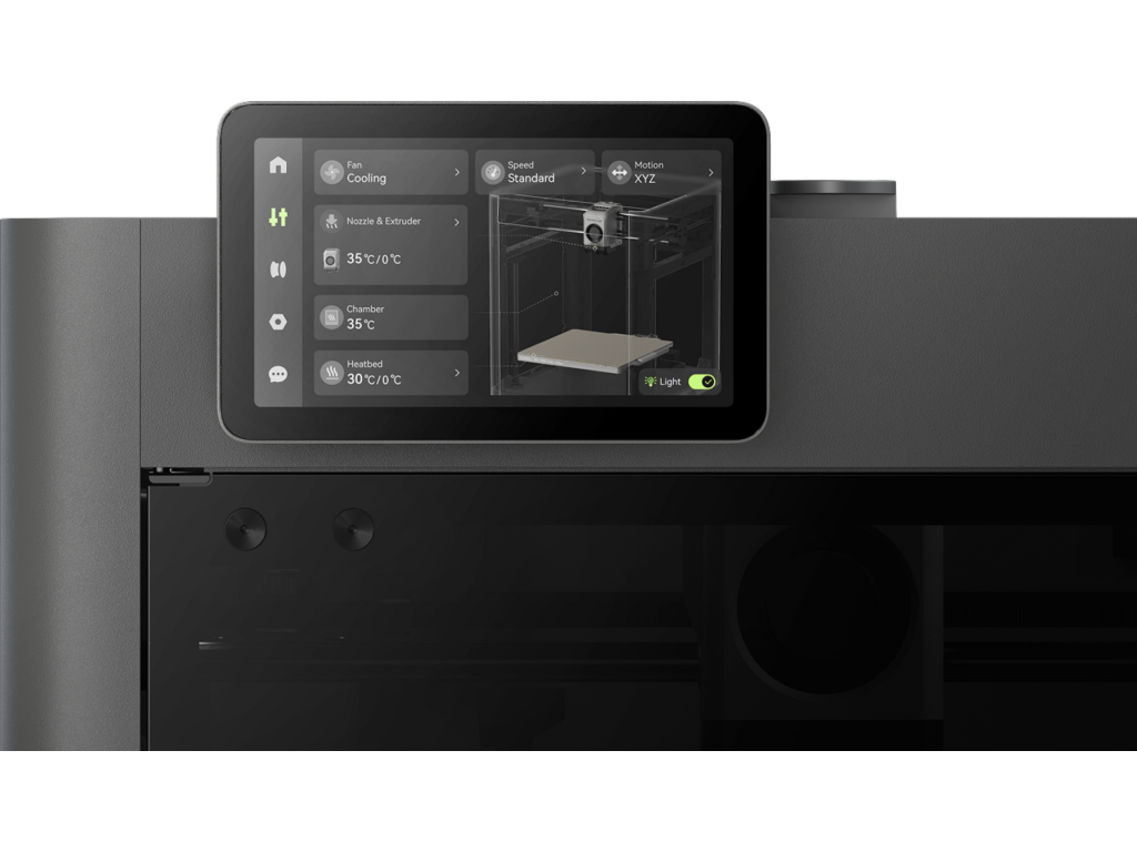 V režimu Heat tiskárna aktivně vyhřívá komoru na 65 °C s cirkulací filtrovaného vzduchu – ideální pro ABS, ASA, PA a PC s minimálním warpingem a maximální mezivrstvovou adhezí. V režimu Cool přivádí čerstvý vzduch pro PLA s ostrými převisy. Třístupňová filtrace (G3 + H12 HEPA + aktivní uhlí z kokosových skořápek) eliminuje pachy i částice – bezpečné pro domácí použití.